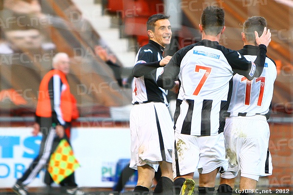 Saturday, 27th Oct 2012 Craig Dargo celebrates the third with Joe Cardle and Josh Falkingham! Pars v Cowdenbeath 27th October 2012.